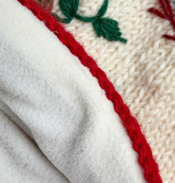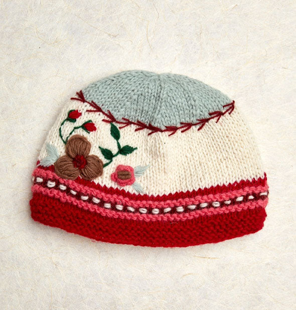 Cranberry reds, soft pinks, and wintry greens come together in a cozy, Nordic-inspired palette on this jaunty chapeau. Hand-knit with care and adorned with cheerful floral embroidery, this beanie brings warmth and joy to chilly days. Meticulously crafted from 100% wool with fleece lining by skilled Nepalese artisans.