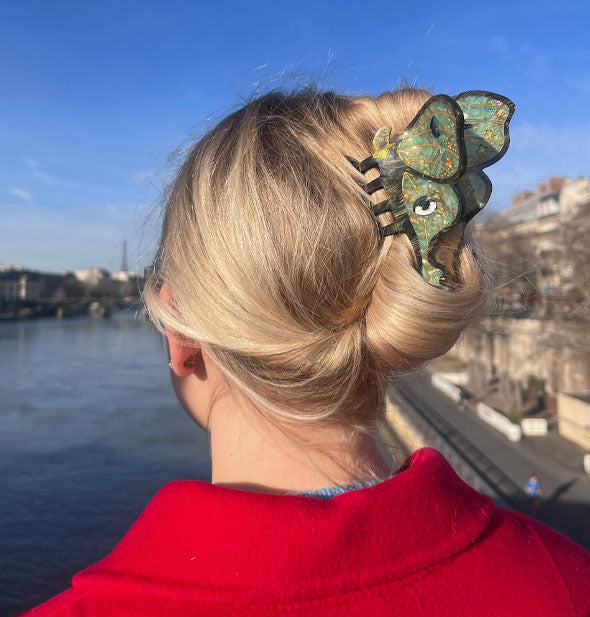 Carefully crafted from cellulose acetate, an eco-friendly, biodegradable material made from recycled wood pulp, this ornate luna moth hair claw is hand-painted, double-sided, and large enough to hold thick hair.