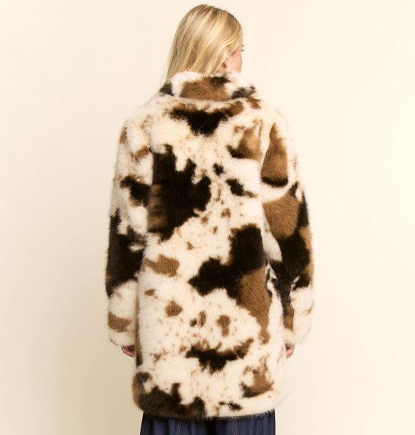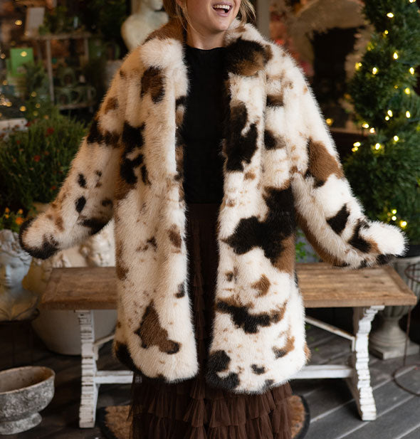 Get a moooove on your outerwear upgrade with this luxurious yet approachable faux fur coat. Features a refined cowhide-inspired pattern in rich neutral tricolor, it blends bold texture with wearable sophistication. Additionally features a notched, rounded collar and side pockets. A standout layering piece for boutique buyers seeking warmth, charm, and seasonless versatility. Ethically made for the conscious customer.