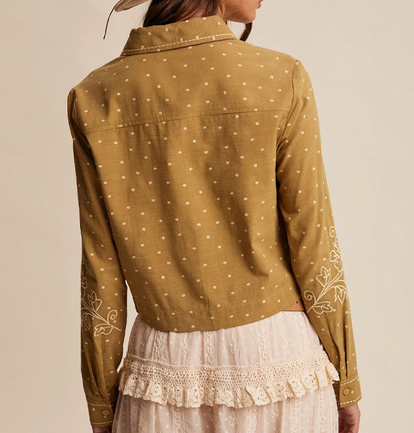 A perfect alternative to the everyday graphic tee, this intricately embroidered button-down top brings autumn-ready texture and Western detail into your wardrobe rotation for a look that feels both vintage and of-the-moment. Western-inspired floral designs at the chest, sleeves, and cuffs add handcrafted charm to soft, breathable cotton fabric that is finished with tiny dotted weaves and accented with intermittent topstitching. A structured collar and boxy silhouette are complemented by a cropped fit in a tuck-friendly length. Model is 5’3” and wearing a size Large.