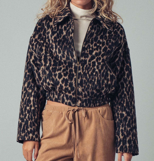 This statement-making layerable piece features a soft, plush feel and dramatic leopard print with a classic point collar, full-zip front, and elasticized cuffs and hem for a snug, shapely fit. Side pockets provide practical ease, while the slightly boxy silhouette adds casual-chic appeal. 100% polyester.