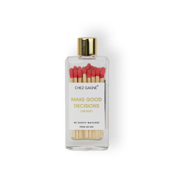 Whether you're playing it safe or playing with fire, these matches are here for your every whim and “good” decisions. Glass bottle with gold lid and side striker contains 40 red-tipped safety matches.