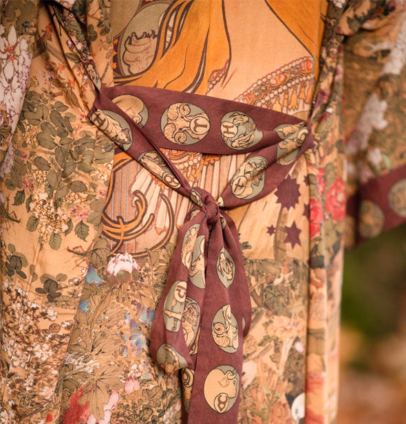 A regal, resplendent celebration of the stories told in the stars, featuring Alphonse Mucha’s iconic 1896 Zodiac lithograph. Mucha’s beloved work features a majestic woman surrounded by the by the 12 zodiac signs and adorned in intricate celestial jewelry, with the addition of a large star to her remarkable crown. The background comes from an incredible ink-on-silk scroll painting by Ueno Setsugaku, created in the 1860s. Trimming this design are Mucha’s zodiac signs on a deep burgundy background. The result is an opulent and elegant take on Mucha’s work, with a nod to the luxe bohemianism of the 1970s. Includes removable belt. Made from 100% viscose derived from plant fibers such as wood and bamboo. Includes removable belt.