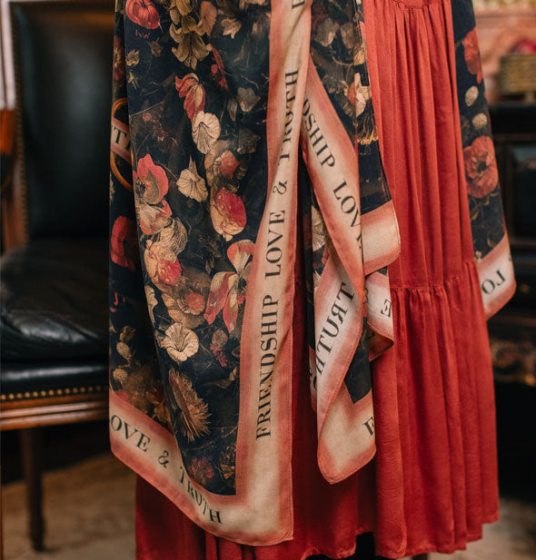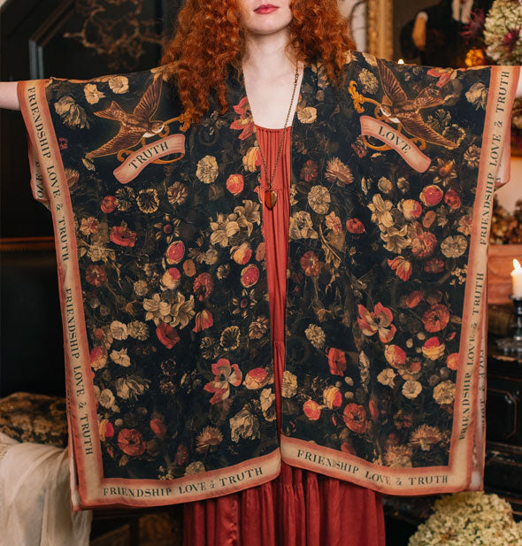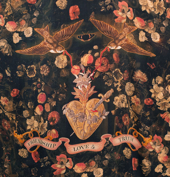 Introducing Heart of Gold: a beautiful and dramatic celebration of the bonds in our lives that endure. Designed using an intricate collage of antique artwork, it features hand-painted swallows from an 1865 scrapbook, floral wreaths from the 1600s, and a sacred heart from Notre Dame in France, which was embroidered with gilded thread and completed in 1872. The two swallows with wings outstretched (traditional symbols of loyalty) carry a ribbon between them as a reminder that even across distances, those we love will always be a part of us. The vintage banner proudly displays the motto, “friendship, love, and truth.” Made from 100% viscose derived from plant fibers such as wood and bamboo. Includes removable belt.