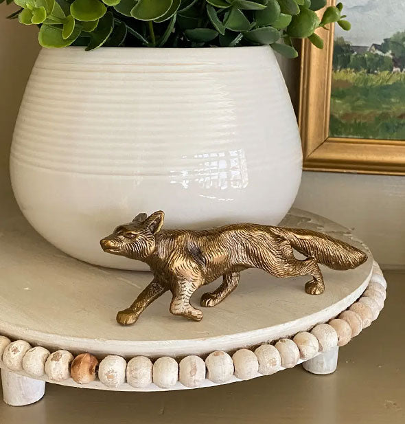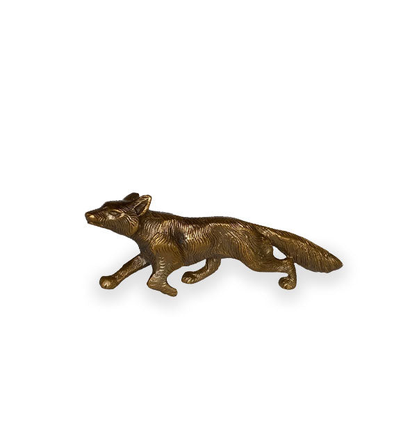 This running fox makes an elegant and heart-warming addition to any home library, mantelpiece, or cabin in the woods. Made of solid brass with stylized etched details in an antiqued finish and measures nearly 6”long and 2.5” tall.
