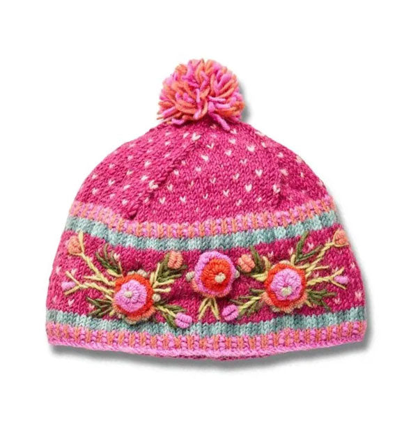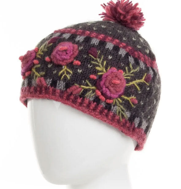 Make a statement with Aubrey, a truly eye-catching knit beanie featuring textural embroidered flowers, festive borders, and a jaunty pom. Crafted from 100% wool, this chilly season hat features intricate floral details reminiscent of delicate hoop embroidery designs and a soft fleece band lining for extra warmth. One size fits most. 100% wool outer, partial polyester interior. Dry clean or hand-wash only. Fairtrade certified and eco-friendly. Handmade in Nepal.