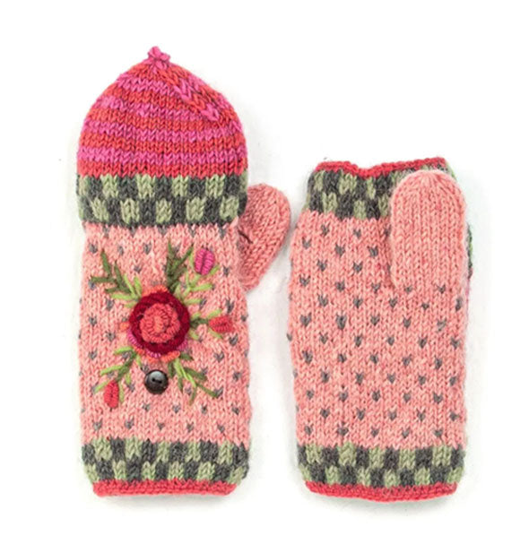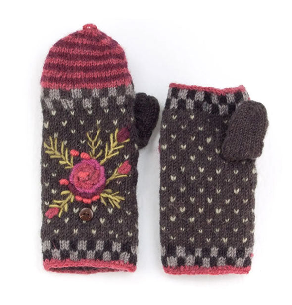 Convertible mittens combine style and functionality and feature textural floral embroidery over mixed jacquard prints that are so classically Aubrey—and so classically cozy. A fold-over flap secured with a wool latch and button easily converts mittens to fingerless gloves. Fully lined with fleece, mittens provide warmth and comfort for the chilliest days.  One size fits most. 100% wool outer with polyester interior. Dry clean or hand-wash only. Hand-stitched by Nepalese artisans under Fairtrade principles.
