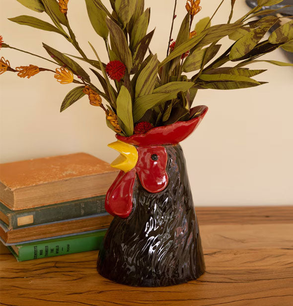 Fill this ceramic rooster head vase with fall foliage or keep pens and markers close at hand. Whatever its use, it makes a great addition to your home decor. Measures 5.5"W x 10"H x 6.5"D with a 2.75" x 1.75" opening. Hand wash with gentle detergent.