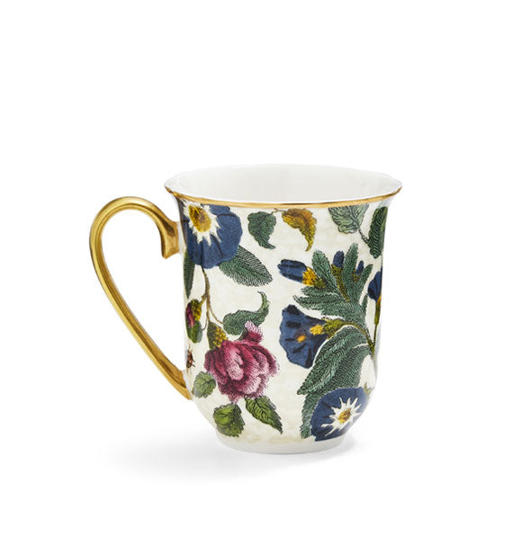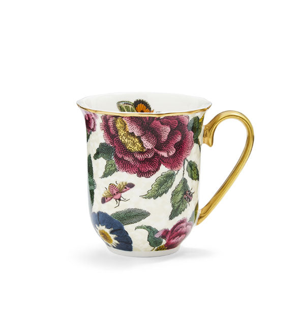 Add a bit of extra sweetness to your next comfort beverage with this lavish mug featuring dancing butterflies among lush florals, accented by hand-painted 22K gold details on its rim and handle. Inspired by the the Victorian era’ss fascination with all things wonderful in the natural world, this piece rebels against the ordinary and rejoices in the uncommon! Crafted from fine china. Mug holds approximately 12 fl. oz. Hand wash.