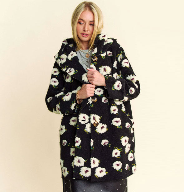 How does your garden grow? In this plush flocked floral overcoat, it blooms abundantly all year round! Featuring a button front, roomy hood, side pockets, stunning floral embroidery, and generous sizing for ultimate coziness with no style sacrificed. 50% rayon, 50% polyester.