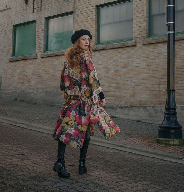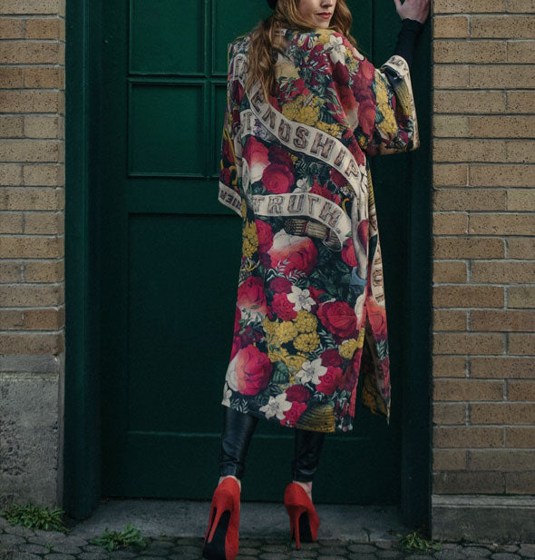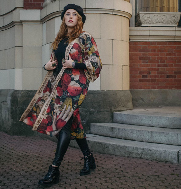 It takes a bold heart to live your truth. To keep reminding yourself that love is the answer, even on your hard days. This eclectic, super cool opera-length kimono borrows an 1880s archival print with its charming woodgrain lettering adapted to build the trim. The result is a beautiful and completely unique piece with a lot of romance and a touch of rock and roll. Includes removable belt. Made from 100% viscose derived from plant fibers such as wood and bamboo. Includes removable belt. One size: 46.5” long; 30.7” wide.