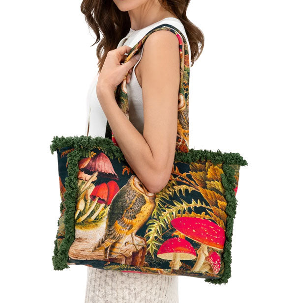 A glorious autumnal scene of woodland toadstools and foliage framing a regal barn owl perched on a tree stump adorns this handy, luxe tote that’s set off by its fuzzy moss-green edges for a cozy carpet bag feel. 100% cotton; measures approx. 13.75”W x 11.5”H x 4.5”D.