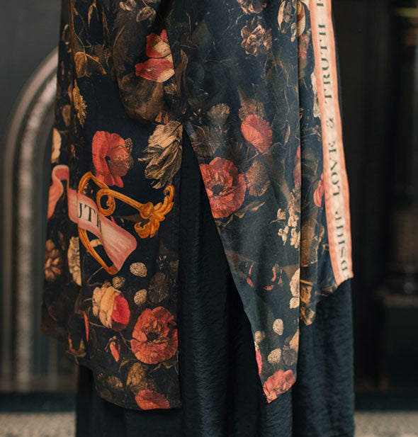 Introducing Heart of Gold: a beautiful and dramatic celebration of the bonds in our lives that endure. Designed using an intricate collage of antique artwork, it features hand-painted swallows from an 1865 scrapbook, floral wreaths from the 1600s, and a sacred heart from Notre Dame in France, which was embroidered with gilded thread and completed in 1872. The two swallows with wings outstretched (traditional symbols of loyalty) carry a ribbon between them as a reminder that even across distances, those we love will always be a part of us. The vintage banner proudly displays the motto, “friendship, love, and truth.” Includes removable belt. Made from 100% viscose derived from plant fibers such as wood and bamboo. Includes removable belt. One size: 46.5” long; 30.7” wide.