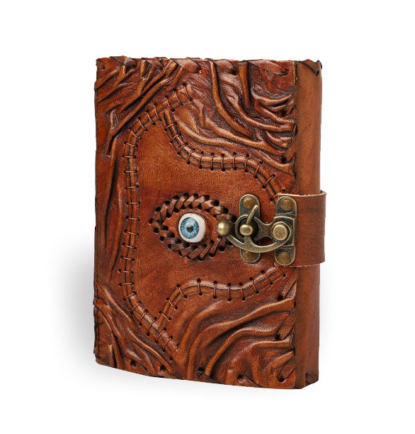 200 vintage-style deckle-edge cotton paper pages are sturdily bound in a hand-stitched genuine buffalo leather cover with heavy textural details and a central all-seeing eye. Book is finished with a brass C-lock and measures 5”W x 7”H.
