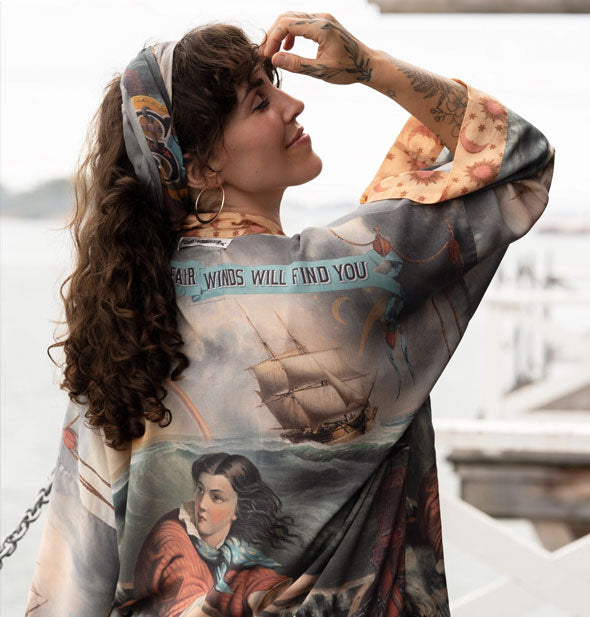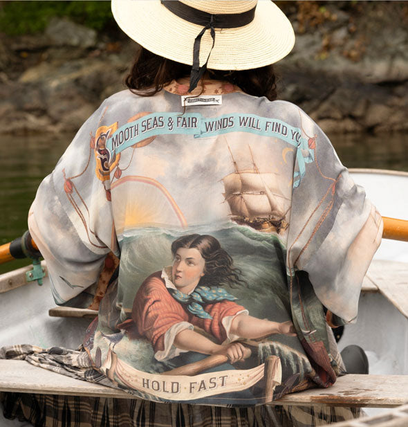 Created using an antique lithograph of a Victorian woman rowing through a storm, this print is a beautiful reminder of hope, tenacity, and strength. The image of a brig ship is from an 1851 painting by Fitz Henry Lane, and the vintage lettering and seagulls are taken from a ship merchant advertising poster circa 1882. The rainbow and sun come from an antique postcard from the same era. For the trim, a 200-year-old textile fragment of suns, moons, and stars (origin unknown) has been reconstructed. The phrase “Hold Fast”—meaning, “hold on tight, you’ll get through this”—is a seafaring expression that sailors traditionally tattooed onto their knuckles, as talismans of protection to keep their grip on the rigging of the ship. Crafted from 100% viscose derived from plant fibers such as wood and bamboo. One size: 23.6” long; 30.7” wide.