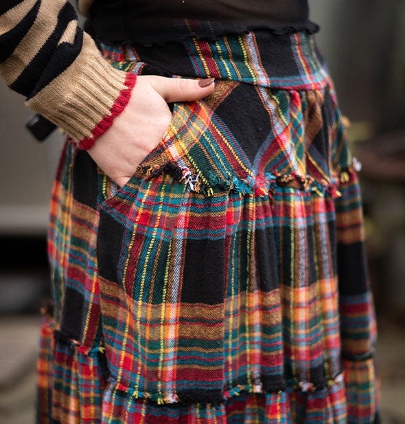 Fun and friendly multicolored mineral-washed plaid on black brightens up every room. An A-line silhouette with rough-edged ruffle tiers creates the best kind of volume with great twirl-ability. Oh, and did we say it has pockets? Fits true to size. 100% cotton. Crab sweater sold separately.
