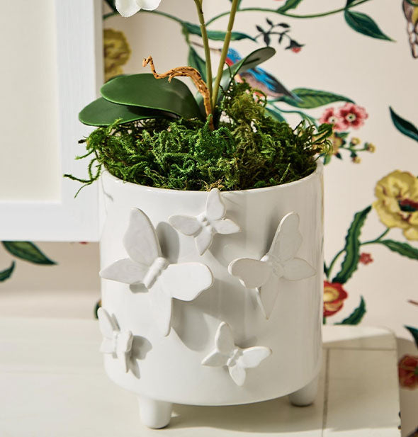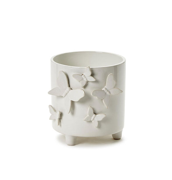 Three-dimensional butterflies commune on the surface of this smooth white ceramic pot, almost appearing as though at any moment they'll take flight! This multipurpose piece features a footed design that is perfect for potting small plants or to serve as a catchall for trinkets and treasures. Measures 5.75” tall with a 5.75” diameter.
