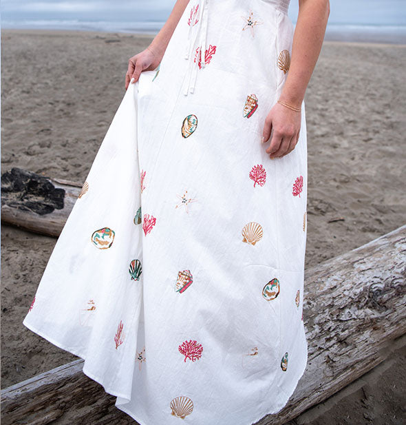 Take a bit of the sea’s magic with you wherever you go. Whimsical embroidered seashells and coral enliven this classic A-line silhouette designed with a ruched bodice and deeply plunged neckline tied at front and back. Dramatic maxi length and crisp white 100% cotton material with a linen feel take this cheerful dress (and you) easily from beachside to borough and back again.
