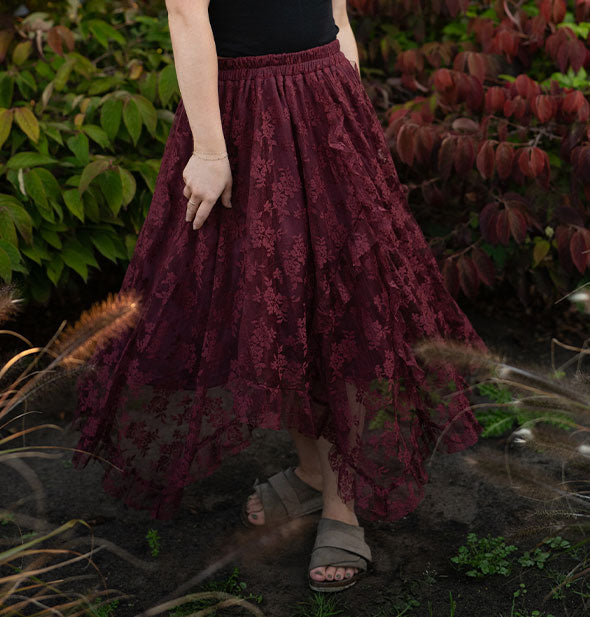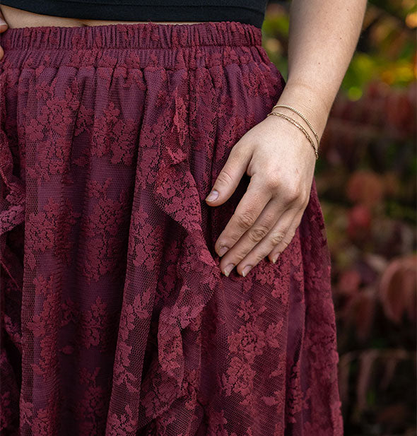 Intricate floral patterned lace cut into a handkerchief style with ruffled edges in a beautiful plummy hue is the peak of romantic allure. An elastic waist ensures comfort and diverse styling options. 100% polyester.